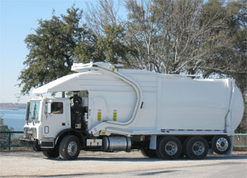 The Pak-Rat Companion never has to leave its pickup route. When it's full, it transfers its load to a rear-loader, although it may also do so at a landfill/transfer station. Available in 6, 8 and 10 cu. yd. models. Shown above is the 10-yard, MSLC-10, model.